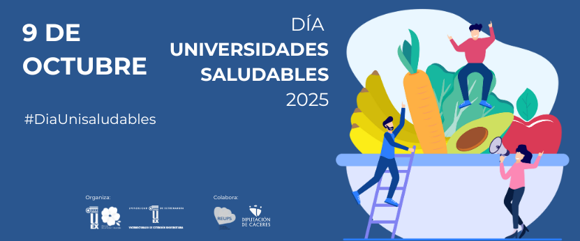 Desde la Oficina de Universidad Saludable, dependiente del Vicerrectorado de Extensión Universitaria, queremos informarles de que el próximo 9 de octubre de 2025 celebraremos en la Universidad de Extremadura el Día de las Universidades Saludables, en el marco de la Red Española de Universidades Promotoras de Salud (REUPS). Con este motivo, hemos organizado un reparto de fruta en todos los Centros de la UEx, de manera que quien así lo desee pueda coger una pieza de fruta, tanto por la mañana como por la tarde.